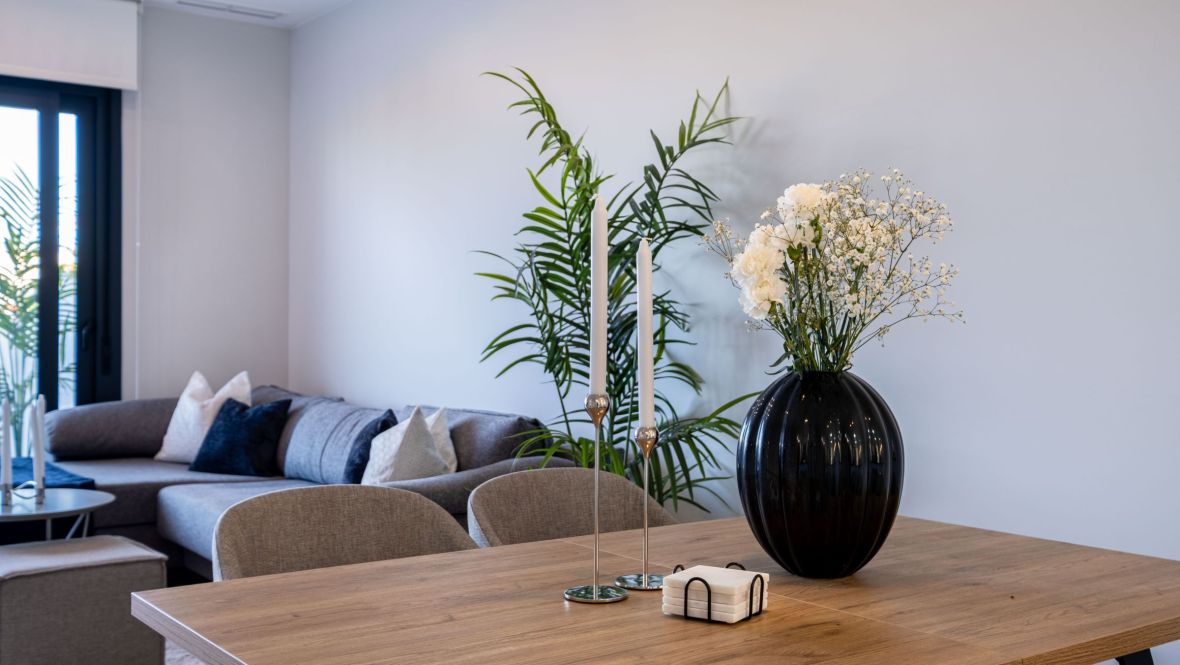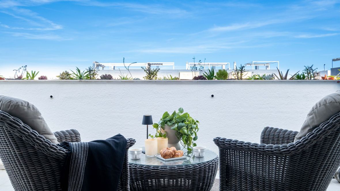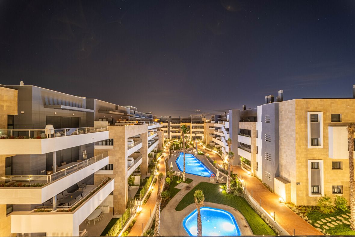 Bienvenido a Flamenca Village y este impresionante ático en perfecto estado. La propiedad, que se completó en fecha tan reciente como 2022, sólo se ha utilizado un par de veces y por lo tanto está en condiciones casi nuevas. La propiedad cuenta con dos amplios dormitorios, uno de los cuales tiene acceso directo a la terraza donde se puede disfrutar del sol tanto por la mañana como por la tarde y dos baños decorados con buen gusto y equipados con duchas y calefacción por suelo radiante. El salón y la cocina de planta abierta proporcionan un ambiente muy luminoso y acogedor. La cocina está equipada con electrodomésticos de alta calidad. Junto a la cocina, hay un lavadero independiente equipado con caldera, lavadora y secadora. También se ha instalado un filtro de agua en el agua de entrada, lo que significa que tiene agua potable, libre de cal, en todos los grifos. El filtro de agua también ayuda a prolongar considerablemente la vida útil del lavavajillas y la lavadora.Desde el salón se accede, a través de la escalera interior, a la amplia terraza de la azotea, amueblada con tumbonas y un grupo de descanso y equipada con una cocina exterior y una ducha. Aquí arriba se puede disfrutar tanto del amanecer como del atardecer, de las vistas a la montaña y al mar desde Torrevieja en el norte hasta La Manga en el sur. La propiedad también incluye dos plazas de aparcamiento en el garaje comunitario. Al garaje se accede a través del ascensor que se encuentra a pocos metros de la puerta de entrada. En el garaje también tiene acceso a la asociación de almacenamiento de bicicletas de buen tamaño. El apartamento se vende completamente amueblado con muebles de alta calidad como nuevos. Flamenca Village es una comunidad cerrada que ofrece a sus miembros instalaciones que suelen encontrarse en los mejores complejos hoteleros. Hay cuatro grandes piscinas, dos de ellas climatizadas en invierno. Cada zona de piscinas tiene también una piscina para niños y dos jacuzzis climatizados. Hay un bonito parque infantil para los más pequeños y un gimnasio cubierto bien equipado con vestuarios, duchas y sauna. En la piscina central hay un agradable bar chillout donde se pueden pedir aperitivos y refrescos. Además, hay vigilancia las 24 horas y un equipo de jardineros y limpiadores que se ocupan del mantenimiento diario. Flamenca Village está situado en el corazón de Playa Flamenca. Está a sólo un corto paseo de dos fantásticas playas, un supermercado, panadería, farmacia y restaurantes. Además, está a sólo cinco minutos a pie del popular mercado de los sábados y del famoso centro comercial